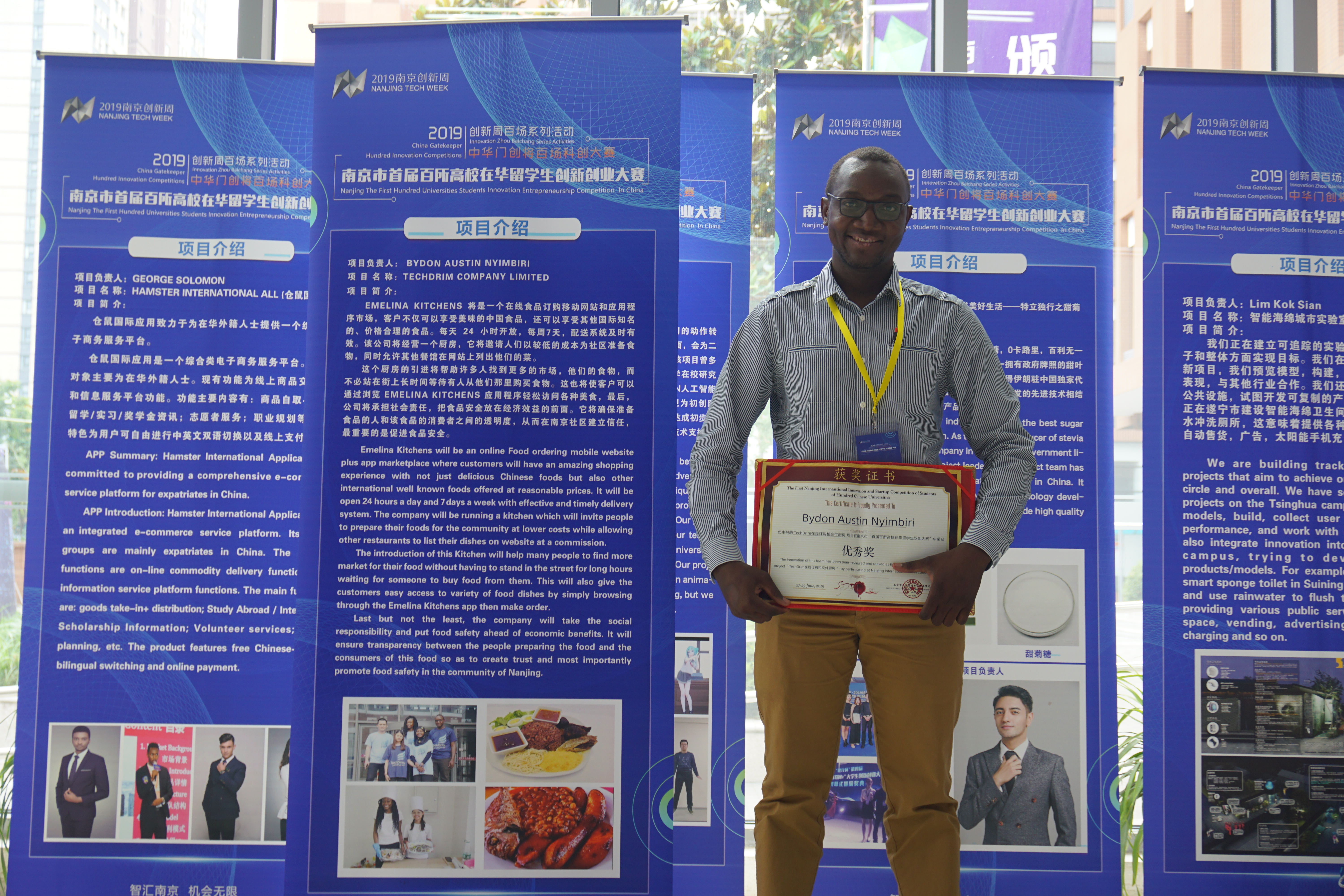 6月27日上午,作为南京创新周系列品牌活动之一的百所高校在华留学生创新创业大赛的半决赛如期举行,参赛的选手覆盖82所高校53个国家,援外硕士班的“在线订购和交付厨房“项目成功从113个参赛队伍中脱颖而出,进入30强,赞比亚的Bydon先生作为团队代表进行了精彩的展示,最终获得优秀奖。