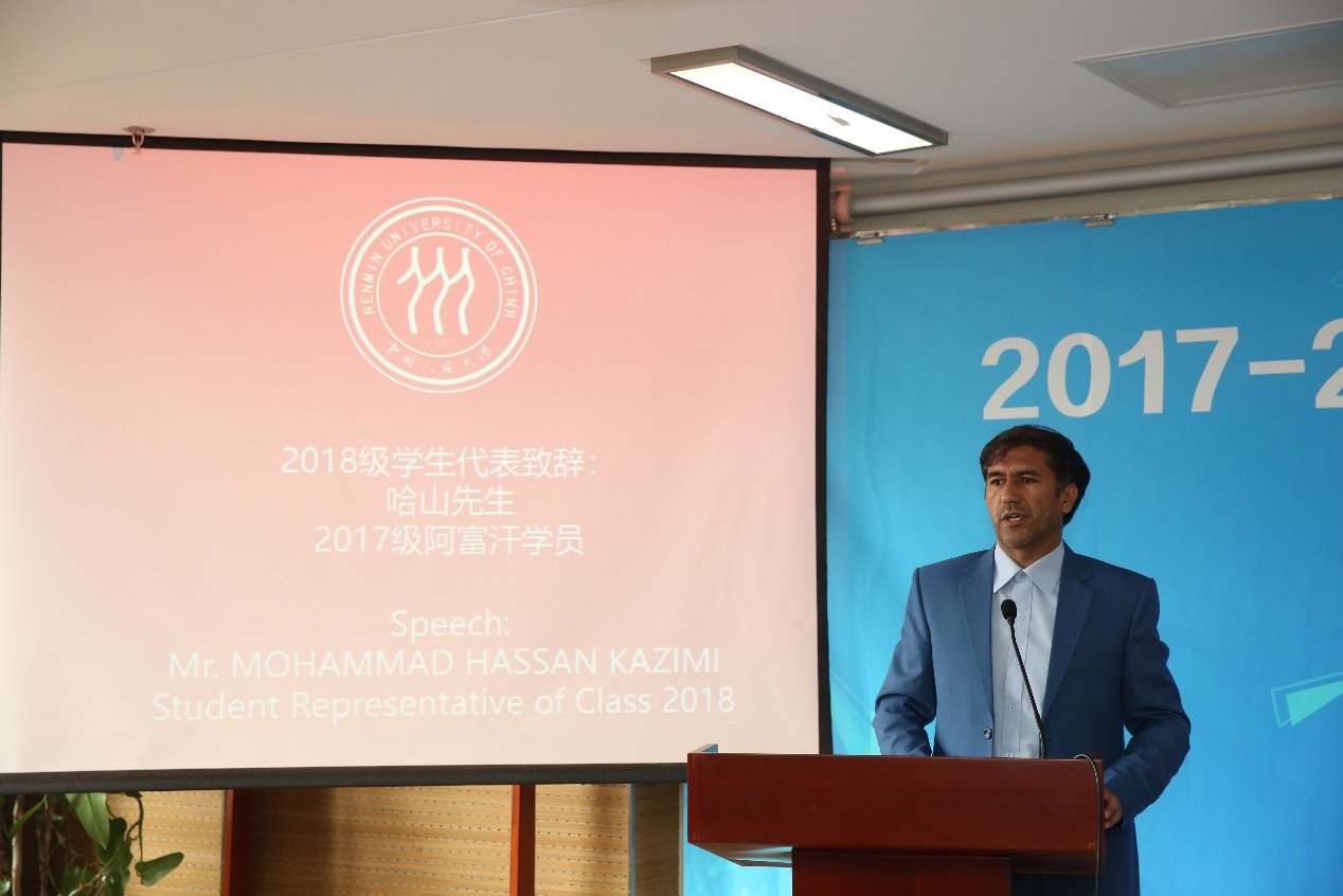 接着,2018级哈山先生代表在校生向2017级毕业的学员们表达了祝贺。他表示在人民大学的两年学习生活是一种独特的经历,毕业是人生新篇章的开始,更重要的是把所学应用到行动中去,正如一位学者所说,“知识不会帮助我们,除非它改变我们的态度,而态度不会帮助我们,除非它改变我们的行为。”他还表示,对中国经济模式的学习将会帮助毕业生们成为自己国家经济变革的推动者和促进国家与国家之间合作的使者。最后,哈山先生表达了对项目提供资金支持的中国政府和商务部的感谢,以及对人民大学腐漫网 的各位老师和工作人员的感谢。