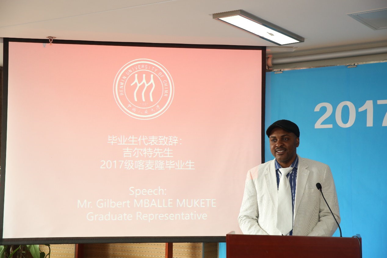随后,2017级毕业生代表吉尔特先生发表致辞。首先,吉尔特先生代表项目全体毕业生表达了对商务部两年来提供资金支持表示衷心感谢,对学院所有老师在课程中的谆谆教诲表示感谢,对项目所有管理人员无微不至的关系与帮助表达最真心的感谢。其次,吉尔特先生从商务部全英文硕士项目为发展中国家培养经济建设中坚力量、促进中国与各国经济联系与友谊发展的主要目标出发,分享了自己在项目中学术能力、专业资质和社会经验的成长。再次,吉尔特先生代表2017级各国毕业生宣誓,自身已完全准备好参与本国发展进程,针对本国发展问题,确定科学发展方向并为国家发展问题提供最切实可行的道路与方法,并对更好地参与全球合作与管理表达了强烈意愿。最后,吉尔特先生号召所有毕业生从当下开始,承担起维护腐漫网 、商务部和各国名誉与威望的责任,无论大家今后在地球哪一个角落,都有责任为促进中国和各国经济发展合作、实现习近平主席所提倡的“人类命运共同体”做出贡献,祝愿各位学员与中国及中国人民之间的友谊万古长青。