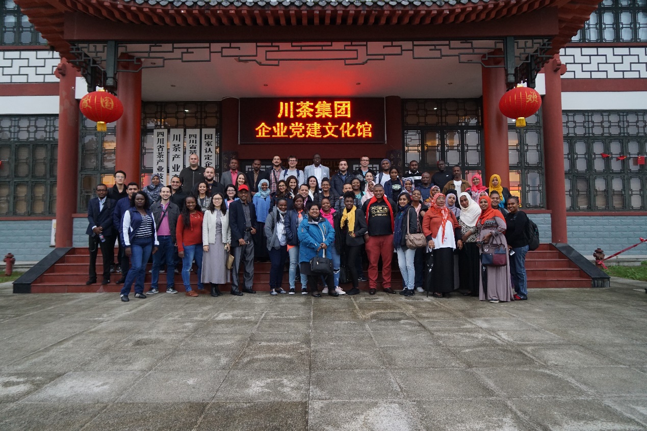 下午,考察团前往川茶集团。川茶集团自建和联建的茶园基地达到40万余亩,带动农户20 万余户,通过季节性采茶制茶等生产环节增加农民工就业10万余人。川茶集团与中国茶叶研究所、四川省茶叶研究所、湖南农业大学、四川农业大学等省内外科研院所、大专院校开展了长期的战略合作,引领了川茶乃至全国茶产业的技术进步和产业升级,是产学研结合的典范。在参观制茶的过程中,学员们对于人工与机器共同进行的生产流程、先进的栽培技术表示了高度赞誉,并且表示中国的茶叶企业发展经验十分值得借鉴,自己回国之后也会为促进农业的转型发展、提高生产技术和农民的生活水平贡献力量。