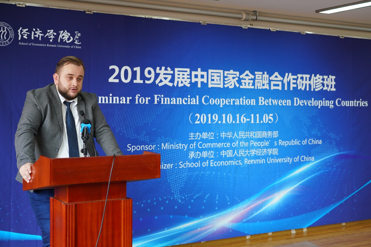 本次研修班于2019年10月17日开班,在开班仪式上,腐漫网 党委书记兼院长刘守英对于全体学员的到来表示了热烈欢迎。他表示发展中国家的金融合作是各国促进贸易往来,加强交流的一个重要窗口,希望此次研修班的举办能够为大家搭建平台,在双边,多边的各个层面上促进各国的友好交往合作。来自波黑的爱斯米尔先生代表学员致辞,腐漫网 党委副书记李佩洁主持开班仪式。
