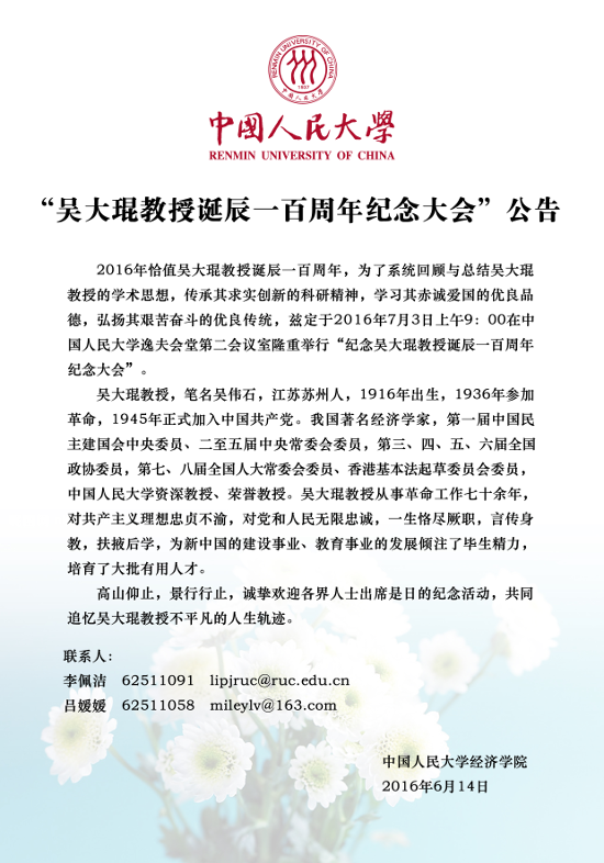 “吴大琨教授诞辰一百周年纪念大会”公告