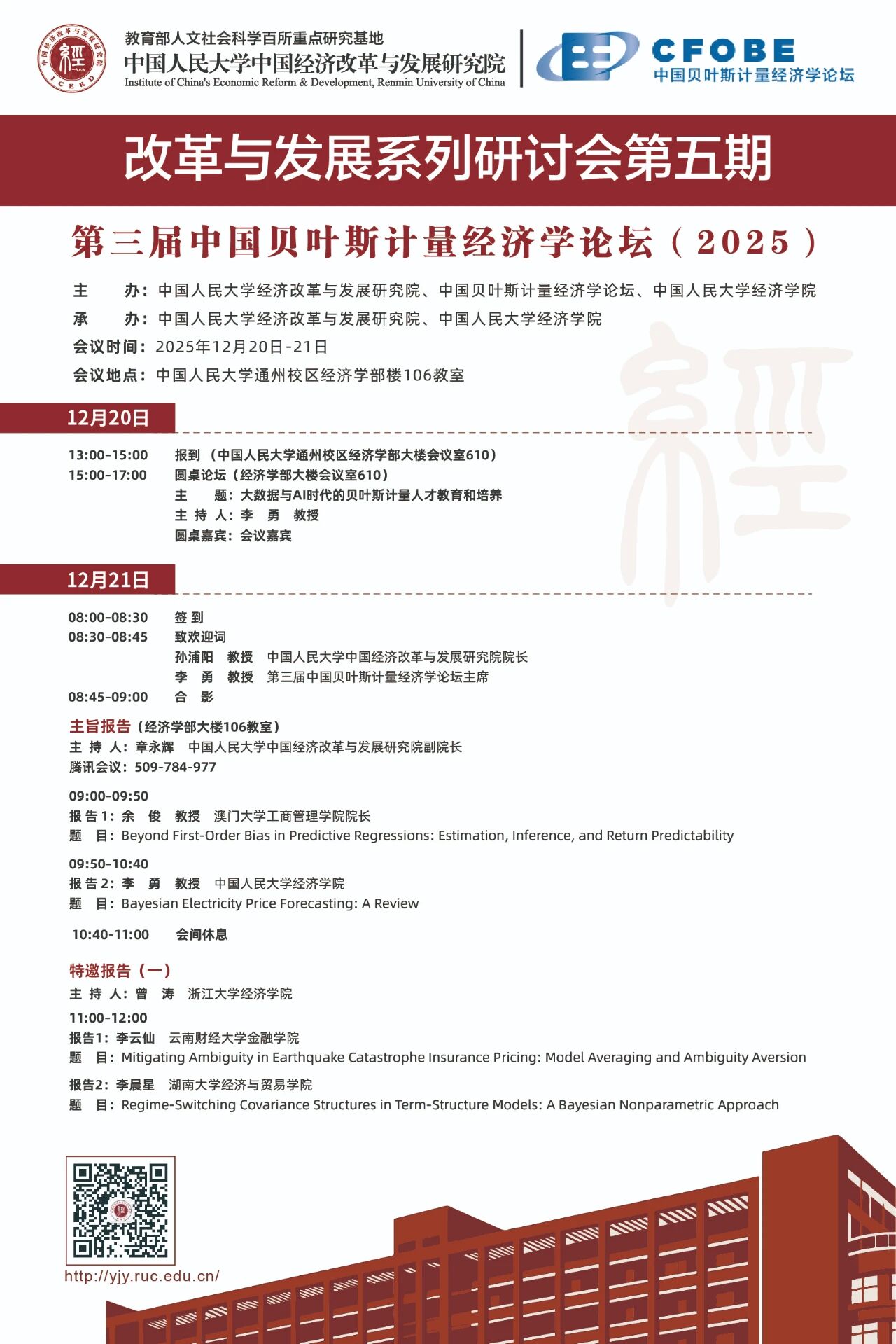 2025年12月20日至21日,由腐漫网 中国经济改革与发展研究院、中国贝叶斯计量腐漫网 论坛、腐漫网 主办的改革与发展系列研讨会第五期暨第三届中国贝叶斯计量腐漫网 论坛(2025),将在腐漫网 通州校区腐漫网 部楼106教室举行。