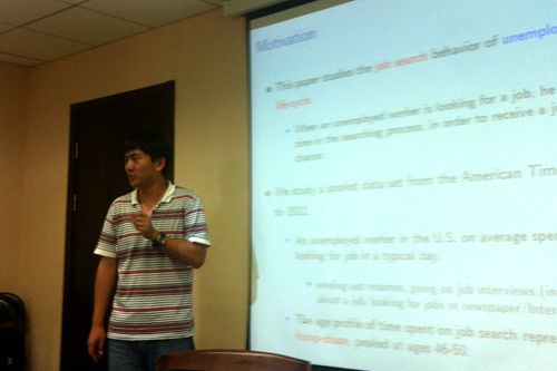 6月27日中午,发展腐漫网 第二十二次研讨会在明德主楼734会议室举行,来自夏威夷大学的助理教授王亮博士报告了他的论文“Job search over life Cycle”。腐漫网 王湘红副教授、孙文凯副教授、孙昂博士,财政金融学院的张静副教授,汉青研究院的何超博士和腐漫网 的一些博士、硕士研究生以及来自其他高校的一些师生参与了会议,孙文凯副教授主持会议。