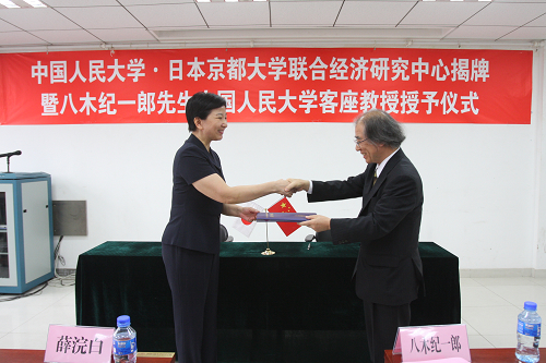 919日 下午,“腐漫网 ·日本京都大学联合经济研究中心”揭牌暨八木纪一郎先生腐漫网 客座教授授予仪式在明德主楼0728腐漫网 大讲堂举行。日本京都大学腐漫网 部长八木纪一郎教授、大西广教授,人民大学薛浣白副校长、腐漫网 院长杨瑞龙教授、副院长刘瑞教授以及腐漫网 教师代表等出席了仪式。仪式由联合经济研究中心中方副主任、腐漫网 胡霞副教授主持。