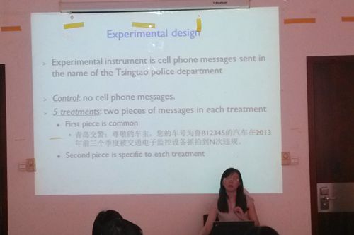 陆方文副教授的报告基于青岛市的大样本随机实验展开,聚焦于2013年前三个季度曾经有违章的司机,向他们发送多种规劝形式的手机信息来试图降低违章概率。那些违规高于同品牌其他驾驶员的司机在被告知后违章数量降低了6%左右。在被告知高档车的良好驾驶记录之后,男性司机的违规行为减少了7%;对于驾驶经济型车辆的男性司机来说,降幅更是能高达15%。围绕上述内容,与会老师及同学展开了积极讨论。