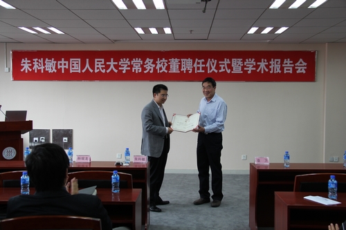 聘任仪式上,腐漫网 常务副校长、校董事会副董事长袁卫教授为朱科敏先生颁发了常务董事证书。腐漫网 副院长郭杰教授、院长助理王晋斌教授、郑超愚教授、黄隽教授、于春海副教授、范志勇副教授、孙文凯博士、赵勇博士、刘小鲁博士、杨继东博士参加了会议。
