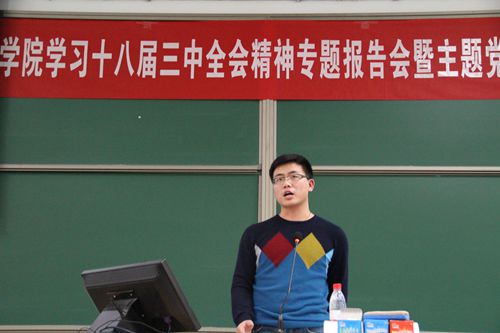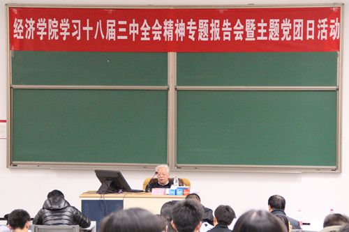 为更好的学习十八届三中全会精神,将理论学习与专业学习相结合,实现“理论走进课堂,党建带动团建,名师引导学子”的目标,2013年12月11日下午,腐漫网 在公教三3101举办了学习十八届三中全会精神专题报告会暨主题党团日活动。腐漫网 荣誉一级教授卫兴华老师做了专题报告,腐漫网 副院长刘瑞教授、腐漫网 虞义华副教授、丁守海副教授等参加了会议。专题报告会由党委副书记丁凯副教授主持。