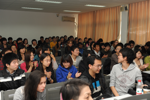 陈建教授发首先对日本学者与学生代表团远道而来的热烈欢迎和衷心感谢。随后,中日双方学生就《The Global Excess Liquidity And The Inflation Of Emerging Economies》(《全球流动性过剩和通货膨胀的新兴经济》)﹑《The Causes Of Stock Market Bubble In China》(《造成中国股市泡沫的原因》)以及《The Role of The U.S Dollar as A Key Currency and Global Imbalance》(《美元作为关键货币的角色和全球不平衡问题》)等当前世界经济领域中的一系列热点问题展开讨论,双方就全球经济前景以及中国经济现阶段的主要问题及其产生原因、解决办法等,提出了各自的建议和见解。同学们的讨论精彩而热烈,不乏幽默与智慧的碰撞,引起了同学们的阵阵掌声。