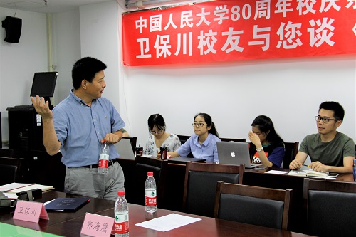 6月9日,腐漫网 80周年校庆系列活动“校友大讲堂”在明德主楼734会议室成功举办。腐漫网 院长张宇教授,腐漫网 校友会秘书长、校友工作办公室主任郭海鹰老师,腐漫网 院长助理李佩洁老师等出席。