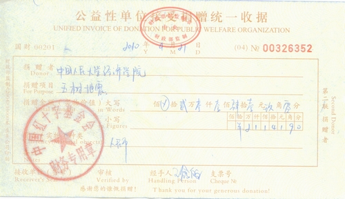 捐款活动结束后,腐漫网 团委派出专人将所得款项送往东城区中华红十字总会,请中华红十字会转交至玉树同胞的手中。同时,腐漫网 教职工的捐款活动也正在积极的进行当中。