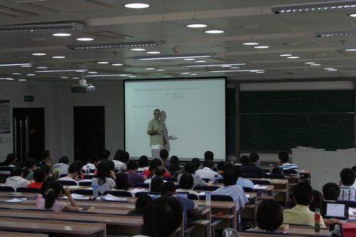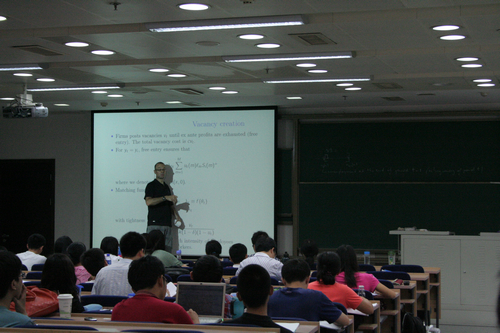 在讲授理论模型时,罗宾教授还不忘引用一些贴近生活的例子来解释抽象的模型,尤其是在讲解Partial equilibrium search model的时候,生动而幽默的例子让在座的学员充分领会到理论模型的深刻魅力。课上各位老师和同学和罗宾教授进行了充分的交流,对于问题幽默而不失深度的解答使得罗宾教授给大家留下了深刻印象。有的学员更是希望能在以后有机会和罗宾教授进行更深层次的交流。