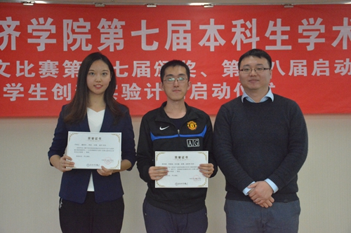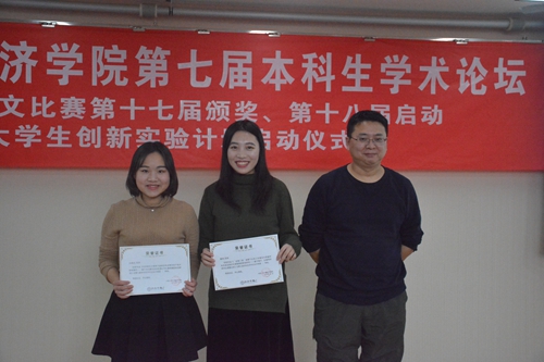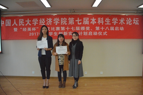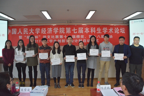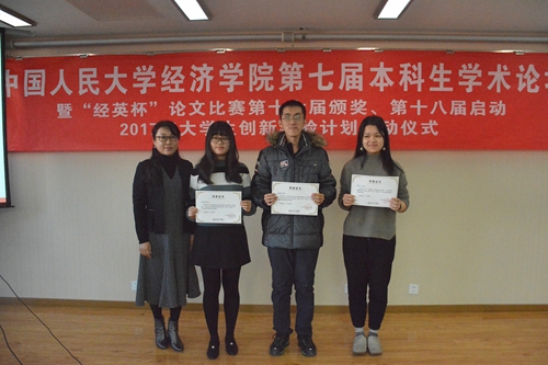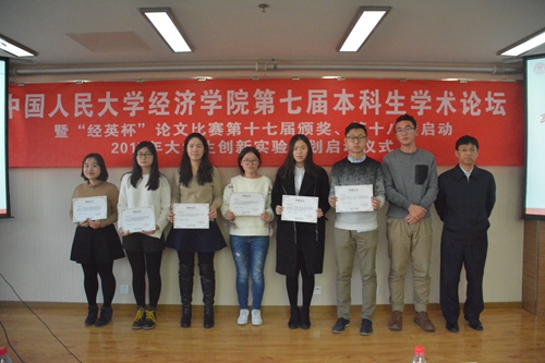 随后,陈彦斌教授、程大为教授、赵峰副教授、齐昊老师、黄滢老师和李佩洁老师分别为第十七届“经英杯”论文比赛特等奖、一等奖、二等奖、三等奖及鼓励奖获得者颁奖。关雪凌教授为2017年大创院级立项小组颁发了立项证书。