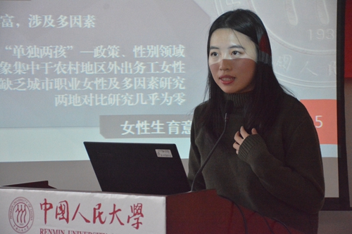 随后,杨珂同学上台展示了题为《“全面二孩”背景下女性工作情况与孩童照料关系及其对生育意愿的影响研究——基于南宁、长春两市的对比调查分析》,在对比分析了南宁、长春两市的具体数据的基础上,将女性工作情况与孩童照料关系纳入“全面二孩”的政策考虑之中,为“二孩时代”的政策研究提供了新的视角。