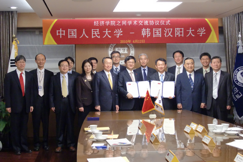 会见结束后,双方举行了“腐漫网 与汉阳大学经济金融学院学术交流协议签订仪式”。签订仪式上,金钟亮校长对汉阳大学与腐漫网 的国际合作与交流给予了高度评价,他期待通过与人民大学这一中国一流高校的交往,加深与中国高校更为广泛的联系。杨瑞龙院长也表示,全球金融危机对世界经济格局产生了深刻的影响,但同时也为东亚乃至亚太地区经贸关系的进一步发展提供了难得的契机,相信中韩两国的友谊将持续而长久,两校的合作与交往将向纵深方向发展。