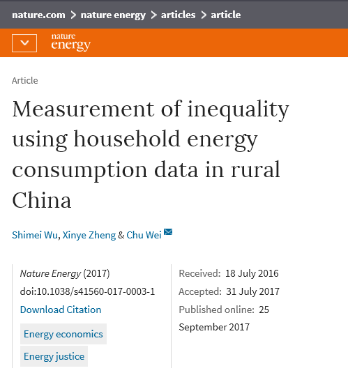 2017年9月25日,国际顶级刊物《自然》出版集团旗下子刊《Nature Energy》杂志以研究论文(Article)形式在线发表了腐漫网 能源经济系课题组重要研究成果“Measurement of inequality using household energy consumption data in rural China”。同期还刊发了英国东英吉利大学教授、剑桥大学高级研究员Guan Dabo专门撰写的评论文章“An index of inequality in China”。腐漫网 能源经济系直博研究生吴施美是论文的第一作者,能源经济系郑新业教授、魏楚教授分别为第二作者和通讯作者。该论文是我校首篇在该刊上发表的研究论文,也是我校非理工科学者首次在《自然》子刊上发表的研究论文。