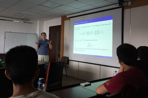 张俊富教授做了《Measuring the Stringgengcy of Land use Regulation: The case of China`s Building-Height Limits》的主题报告,报告内容以中国高速城市化过程中政府对城市楼房建筑容积率的限制水平不同出发,利用中国300多个城市10年的面板数据,讨论了“如何度量政府对城市建设住房限制严苛程度”以及“限制严苛程度不同会对城市房价产生什么影响”等问题,得出了“政府对城市楼房建筑容积率限制程度越严苛,城市楼房价弹性越大”的结论。