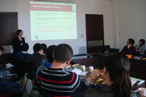 11月23日下午,由腐漫网 企业与组织研究中心(CFOS)主办的第五期组织腐漫网 Seminar在腐漫网 明德主楼621会议室召开。来自MIT(麻省理工学院)斯隆管理学院的博士候选人郑恩莹报告了她的英文工作论文“Workers’ Social Networks and Managerial Ideologies: Improving Labor Standards in China”。