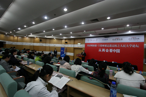 4月6日晚,经济观察报-上投摩根走进高校之人民大学论坛在腐漫网 逸夫会堂第二报告厅举行。会议主题为从两会看中国。论坛由腐漫网 、经济观察报、经济观察网、上投摩根基金管理公司联合主办。国务院参事任玉岭、光大证券研究所副所长潘向东和燕京华侨大学校长华生、经济观察报副总编辑文钊出席论坛并发言。论坛由腐漫网 副院长刘元春教授主持。