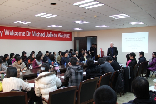 会见后,Michael Joffe教授在明德主楼734会议室“世纪经英讲坛”发表了题为The Root Causes of Economic Growth Under Capitalism的学术演讲。Michael Joffe教授在演讲中就当今世界资本主义制度下经济运行的特点及经济增长的促进因素等发表了独到、深刻的见解。他还与腐漫网 的师生就公司存在对于经济增长的意义、购买力与经济发展之间的关系等问题进行了热烈的讨论。