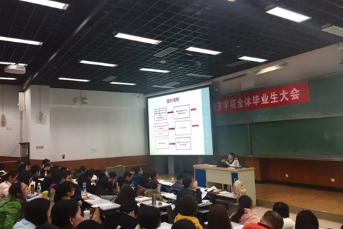 随后学生职业发展中心主任撒莉老师为同学们逐条详细讲解了就业的详细事宜、政策等。撒莉老师首先为同学们介绍了过去两年毕业生的总体去向,经院毕业生在2017、2016年就业率均为100%,虽然就业形势一年比一年严峻,但是腐漫网 的就业形势在全校中排名前列,学生总体就业质量良好,就业单位与去向均在全校中拔得头筹。撒莉老师鼓励大家积极乐观对待求职,树立“先就业后择业”的就业观。介绍了就业信息来源,就业渠道的获取,以及详细讲解就业信息网的使用,指导就业推荐表的填写,梳理了就业协议和劳动合同的签订流程,以及报到证的用途等等。此外,撒莉老师也细致地解答了往年同学们出现疑问较多的户籍、档案、组织关系等问题,并提醒同学们注意人身、财产、交通安全,放平心态,互相理解包容,学生与学院老师相互配合,顺利度过这一年的求职季,做到学业与事业的双丰收。