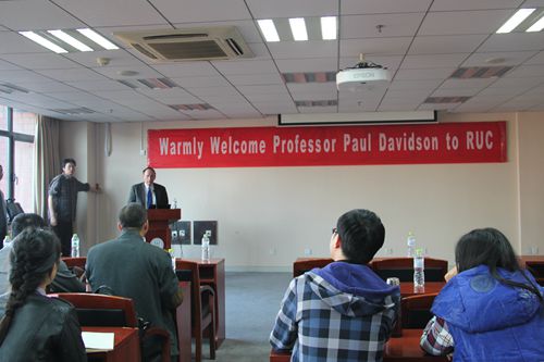 在Davidson教授开始报告之前,腐漫网 院长杨瑞龙教授会见了Davidson教授,腐漫网 邱海平教授、谢富胜教授等参加了会见。杨瑞龙院长首先代表学院对Davidson教授的来访表示热烈欢迎,并简短介绍了腐漫网 的学科设置、科研优势和社会影响等,并邀请Davidson教授在方便的时候专程访问腐漫网 。杨斌副教授、于泽副教授、赵峰副教授、张晨博士和许准博士等参加了报告会。