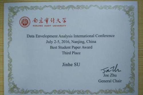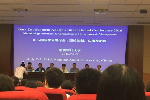 7月2日至5日,DEA国际学术研讨会:理论创新、应用及治理会议在南京审计大学举行,本次DEA会议旨在与前沿的DEA研究人员一起讨论一些主要的创新方法,涉及DEA在管理和治理等方面。我院韩松副教授作为会议邀请专家,负责组织DEA方法方面的论文并担任相关小组的主席。7月4日下午,韩松副教授报告论文“Quantile-DEA Ranking Method for Multi-Attribute Decision Making Problems with Interval Data”,并与在场的专家和学者进行了互动。贾德音同学报告了苏锦河同学与她的合作论文“Cone Ratio DEA Model for Processing Bad Outputs and its Evaluation on the Efficiency of Thermal Power Industry”,并参与了学生优秀论文的评比,在众多博士生论文中脱颖而出,在六篇获奖论文中占有一席之地。