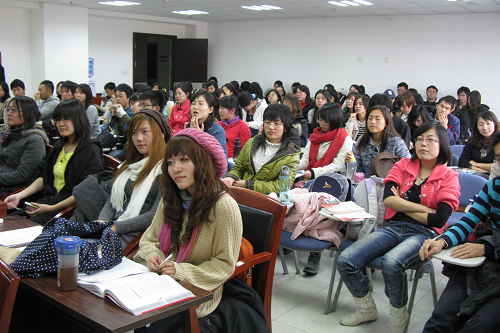 随后,参加交流会的32名日方学生和100名中方学生被随机分成6个讨论小组,并分别被带至5个教室进行小组讨论。各小组分别围绕着Ideas about the Asia Currency”、债券市场的形成、Development of Japanese automobile industry-“TOYOTA”、金融规则与银行行为、Rural economy development as young labor force flows to city、Employment of graduates等话题展开了激烈的讨论,双方学生各抒己见、畅所欲言。