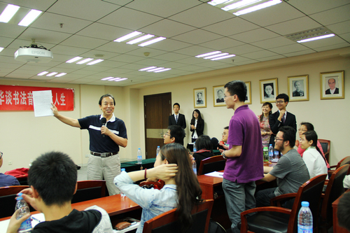在现场热烈期待的掌声中,庞中华先生做了题为“笔尖下的万种创造——与朋友们谈书法艺术与人生”的演讲。透过幽默诙谐的语言、激情活跃的思维,庞中华先生回顾了自己的书法与诗歌人生,并讲述了创作过程中的感悟与体验。他认为对前辈的书法不能一味临摹,失去自我,而应该不断创新,做到读古帖写现代字。谈到书法与音乐之间的联系时,庞中华满怀兴致地为同学们演奏起手风琴,掀起一阵高潮。他指出书法与音乐是相通的,每一个线条都可以用音乐来诠释,同时做了形象生动的演示。在场同学无不被庞中华先生对书法与艺术的激情所感染,现场气氛热烈欢快,不时爆发出阵阵笑声。随后的互动环节,庞中华对同学们的踊跃提问做出了耐心解答。结合自身经历,他向腐漫网 学生寄语,学习的过程是艰辛的,年轻人要多读书,克服急功近利的思想。活动在同学们意犹未尽的掌声中落下帷幕。