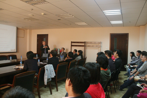 随后,Geoffrey J.D. Hewings 教授发表了题为《港口效率与区域发展》和《基于地震减轻战略的区域宏观经济与网络系统的整合》两场学术报告。Geoffrey J.D. Hewings 教授从目前的研究现状与有待解决的问题讲起,引出文章的研究目的与研究目标,然后分别结合巴西和美国的情况,对模型的构造过程和构造方法进行了系统阐述。在此基础上进行了仿真模拟。最后,Geoffrey J.D. Hewings 教授与腐漫网 师生进行了热烈的讨论。