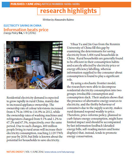 近日,腐漫网 副教授虞义华及合作者郭琎发表在SSCI期刊Energy Policy(5年影响因子4.599)上的论文“Identifying Electricity-saving Potential in Rural China: Empirical Evidence from a Household Survey”被世界顶级期刊Nature Energy以重大研究发现(Research Highlights)摘录评论。