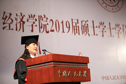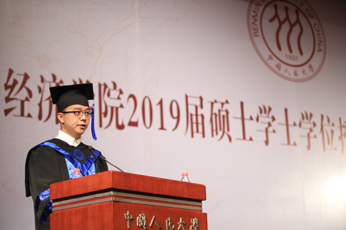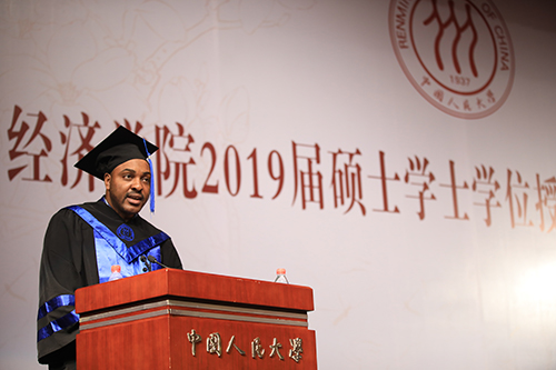 随后,腐漫网 硕士毕业生林文贵、本科毕业生王疆妮和喀麦隆留学生、援外硕士毕业生吉尔特作为毕业生代表发言。他们都真诚表达了对母校和经院的深情、对经院老师的感恩、对学生生活的怀念以及对未来人生的憧憬。毕业后,林文贵将奔赴基层工作,努力实现自己守护一方百姓的梦想;王疆妮同学将作为腐漫网 研究生支教团的一员回到自己的出生地——新疆,开启为期一年的支教生活。吉尔特同学则将返回喀麦隆,继续为建设自己的家乡而努力,正如其在发言中所说的那样,他将继承发扬腐漫网 的优良传统,在回国后充分运用自己在腐漫网 所学到的知识为非洲建设贡献力量,同时尽可能发挥作为中国与喀麦隆乃至中非之间的友好桥梁作用,竭尽所能,共同促进中非友谊继续良好发展。
