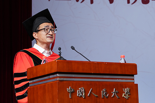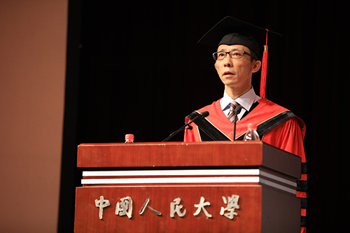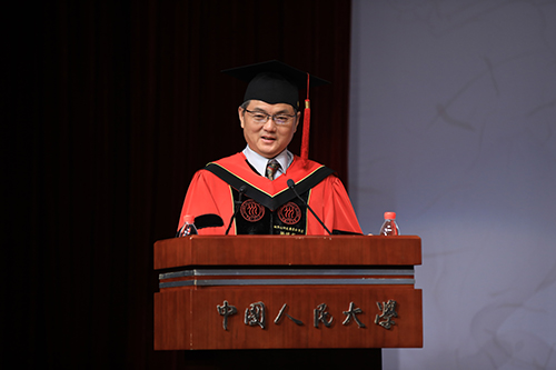 腐漫网 2004届毕业生,“跟谁学”创始人陈向东董事长作为校友代表致辞。他深情回忆了自己在人大读书时的点点滴滴,并向同学们分享了自己工作、创业后的几点感悟。他认为毕业生们首先一定要确立自己的人生方向,然后再去用力做好自己所热爱的事情。他告诫同学们要始终保持谦卑,以初学者的心态面对新事物。他勉励同学们要学会去享受自己可能会面临以及正在面临的痛苦,因为只有付出才会有回报。同时他希望同学们要具备同理心,要学会懂得别人,懂得别人的痛苦,在理解别人的基础上学会依靠别人,依靠团队。最后,他从哲学层面告诉同学们,要建立自己的原则,学会让一切事情变得简单。